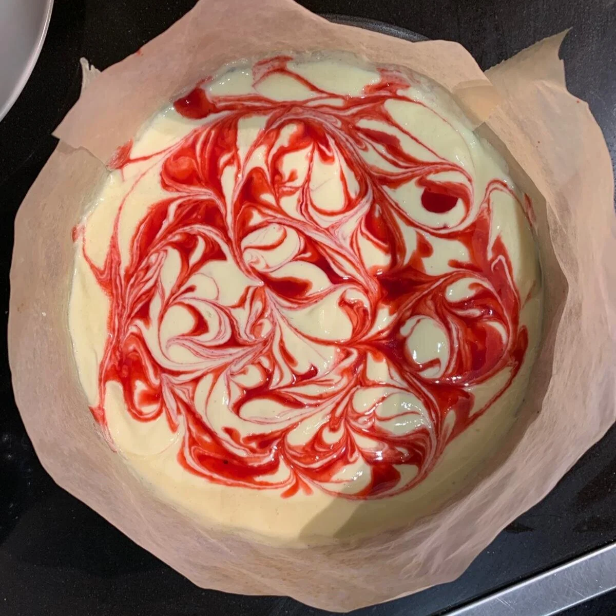 Now take a spoon and randomly drop this coolie in blobs around the cake. Then take the end of a spoon and swirl in an 8 form around the cake to form the raspberry swirls on the surface of the cake.